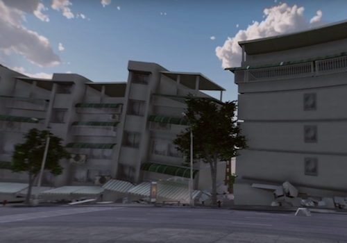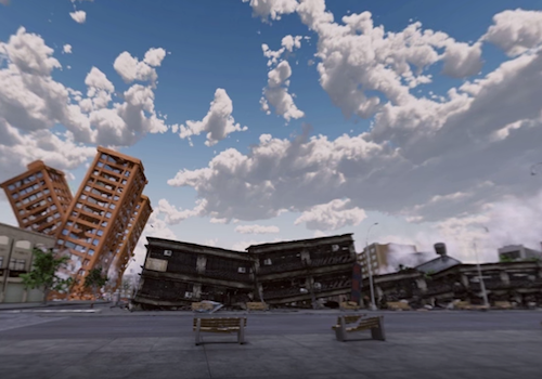 Feature: 民眾就座地震體驗區,戴上VR眼鏡後,可體驗地震3級至7級不同的強度,看著四周房屋陸續倒塌,體驗地震災害的可怕。遊戲設計可供八位民眾同步觀賞VR動畫影片,隨著劇情的發展,真實感受地板震動,模擬地震發生的可怕。